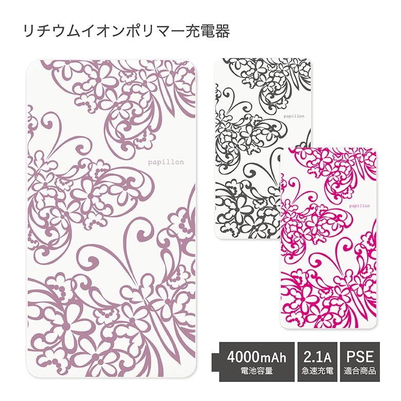 名称 papillon 4000mAh リチウムイオンポリマー充電器 2.1A 対応機種 microUSB端子を持つスマートフォンやタブレット等(※iPhoneやiPodなどに使用する場合は、お手持ちの充電ケーブルが必要です) 入出力 2.1A 電池容量 4000mAh 充電回数 約500回まで繰り返し使用可(当社試験結果に基づく目安です) 本体サイズ 大きさ:約H125mm×W67mm×D9mm 主素材 ABS、TPE、PVC ラインナップ パープル/グレー/ピンク セット内容 充電器本体、蓄電専用USB-microUSBケーブル、取扱説明書 印刷加工 日本 ●商品到着後、よろしければレビューにて感想などいただけますと幸いです。